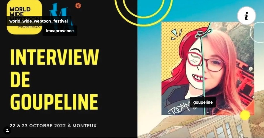Goupeline (diplômée en 2018 de la promotion Arthur de Pins) était invitée du World Wide Webtoon Festival pour venir parler de son webtoon Philophobie (Webtoon France 2021-2022). Dans ce cadre, les étudiant·es de l’IMCA Provence en ont profité pour l’interviewer sur son expérience d’autrice…
