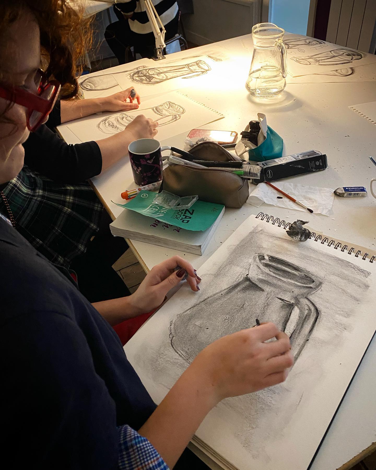 Travail sur l’ombre, la lumière et la transparence en cours de Dessin d’observation pour la promotion Cestac.