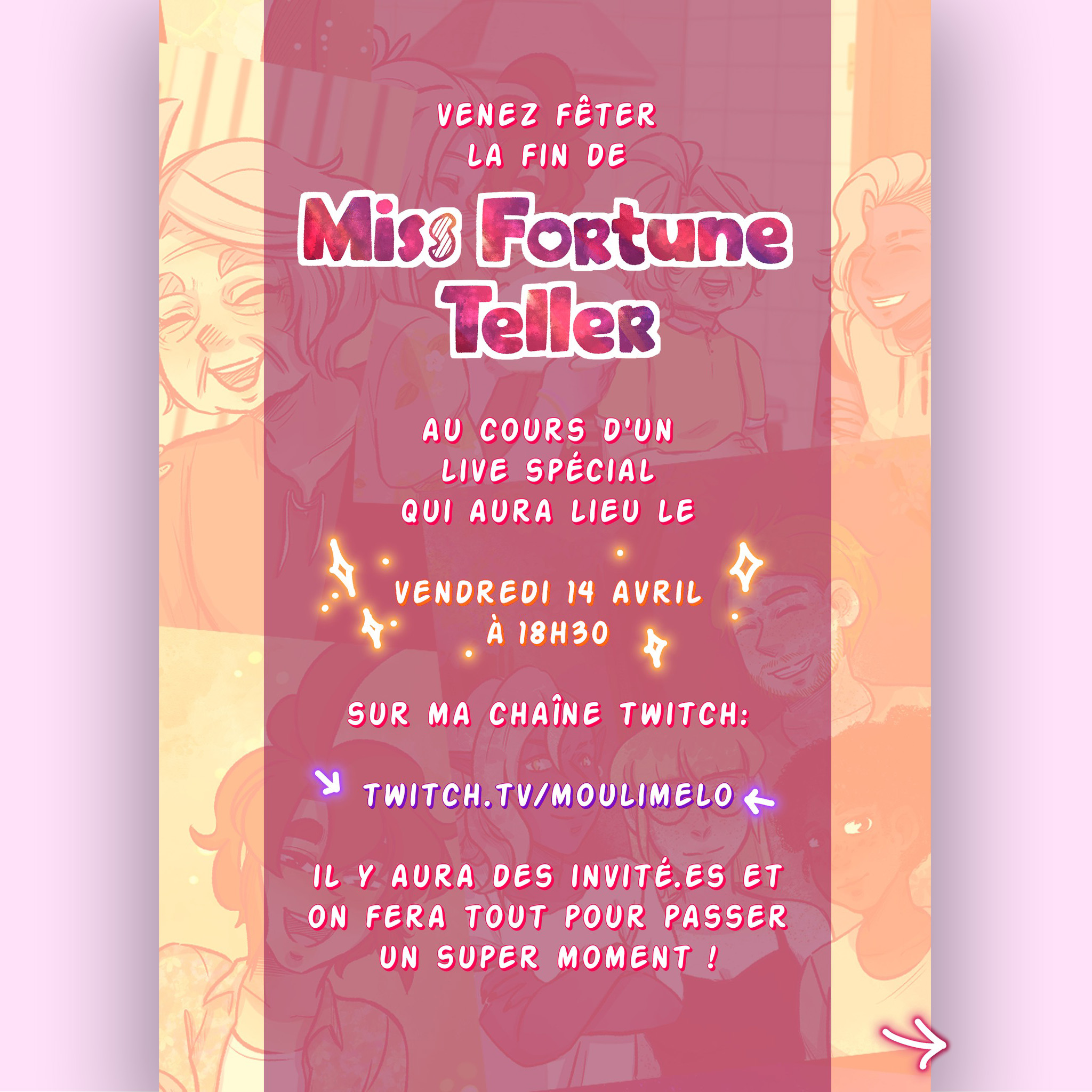 De juin 2022 à avril 2023, Mathilde Lucas (diplômée en 2021 de la promotion Jean-louis Mourier) a réalisé les épisodes de Miss Fortune Teller (édité par Webtoon France). La série étant maintenant complète, Mathilde vous invite vendredi 14 avril à partir de 18h30 à un live stream sur sa chaîne Twitch pour fêter cela et à échanger avec elle sur cette première publication.